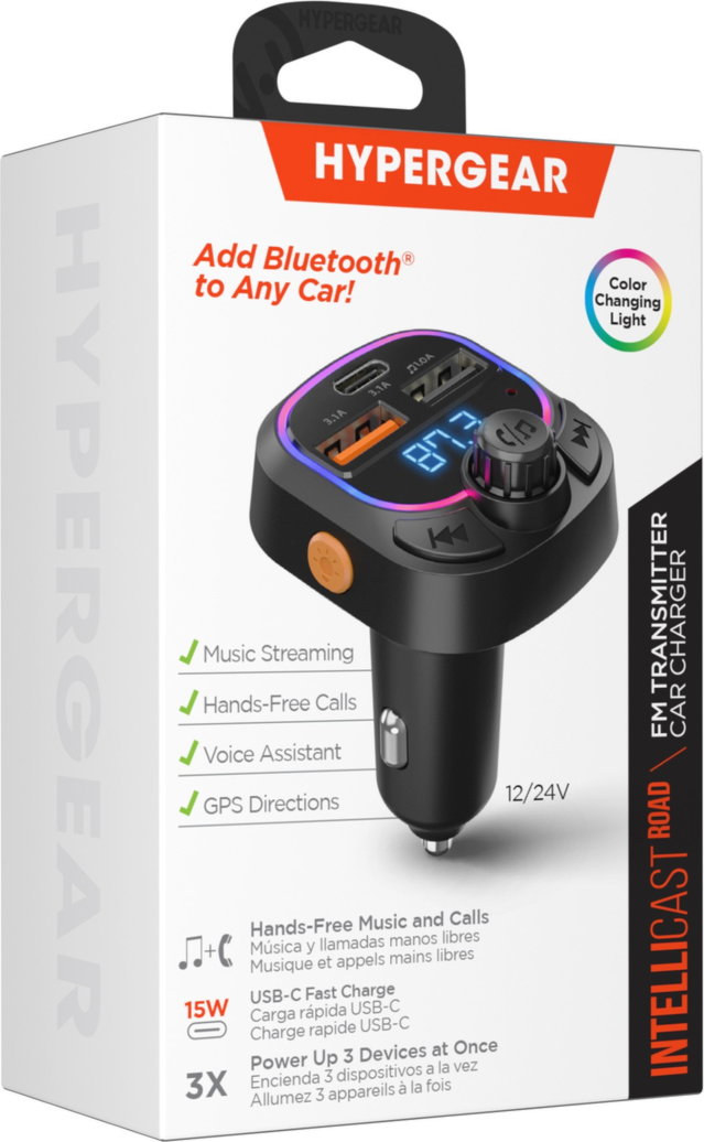 Add Bluetooth functionality to any car! The HyperGear Intellicast Road FM Bluetooth Transmitter allows users to tune the transmitter to the FM radio to stream music, and take hands-free calls through the stereo system. Combining the latest Bluetooth wireless technology and a noise-reducing microphone, get seamless pairing, reliable connection strength, and crystal-clear voice quality. Designed with oversized button controls and a large display for effortless use on busy roads, equipped with a trio of high-speed charging ports so both driver and passenger can fuel up fast. Kitted out with color-changing LED rim lighting to add some flair to your daily drive. Drive smarter, charge faster, and do it all in style with IntelliCast Road.